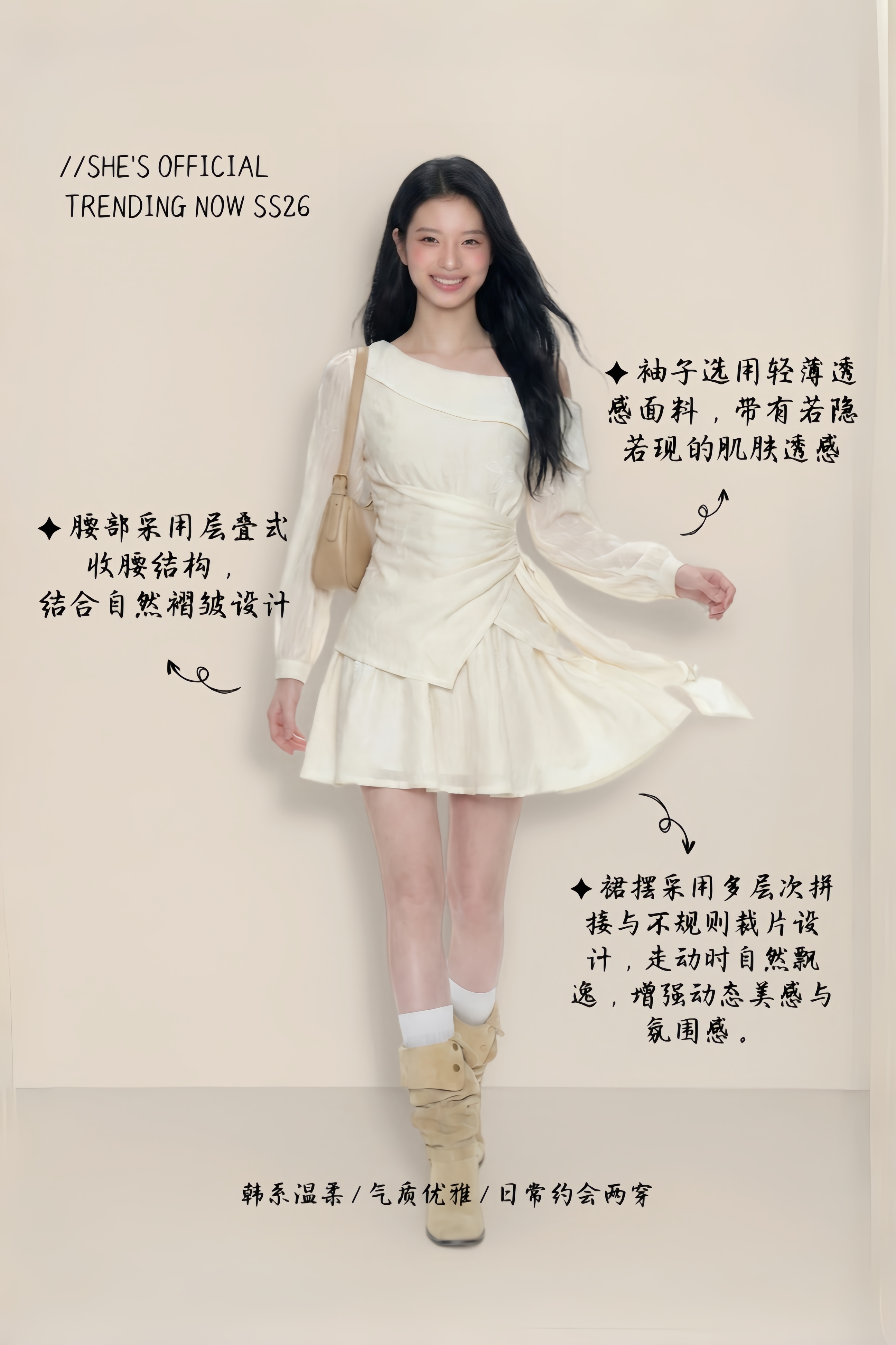 She’s甜酷系蕾丝露肩飘带设计感上衣&叠层次小短裙