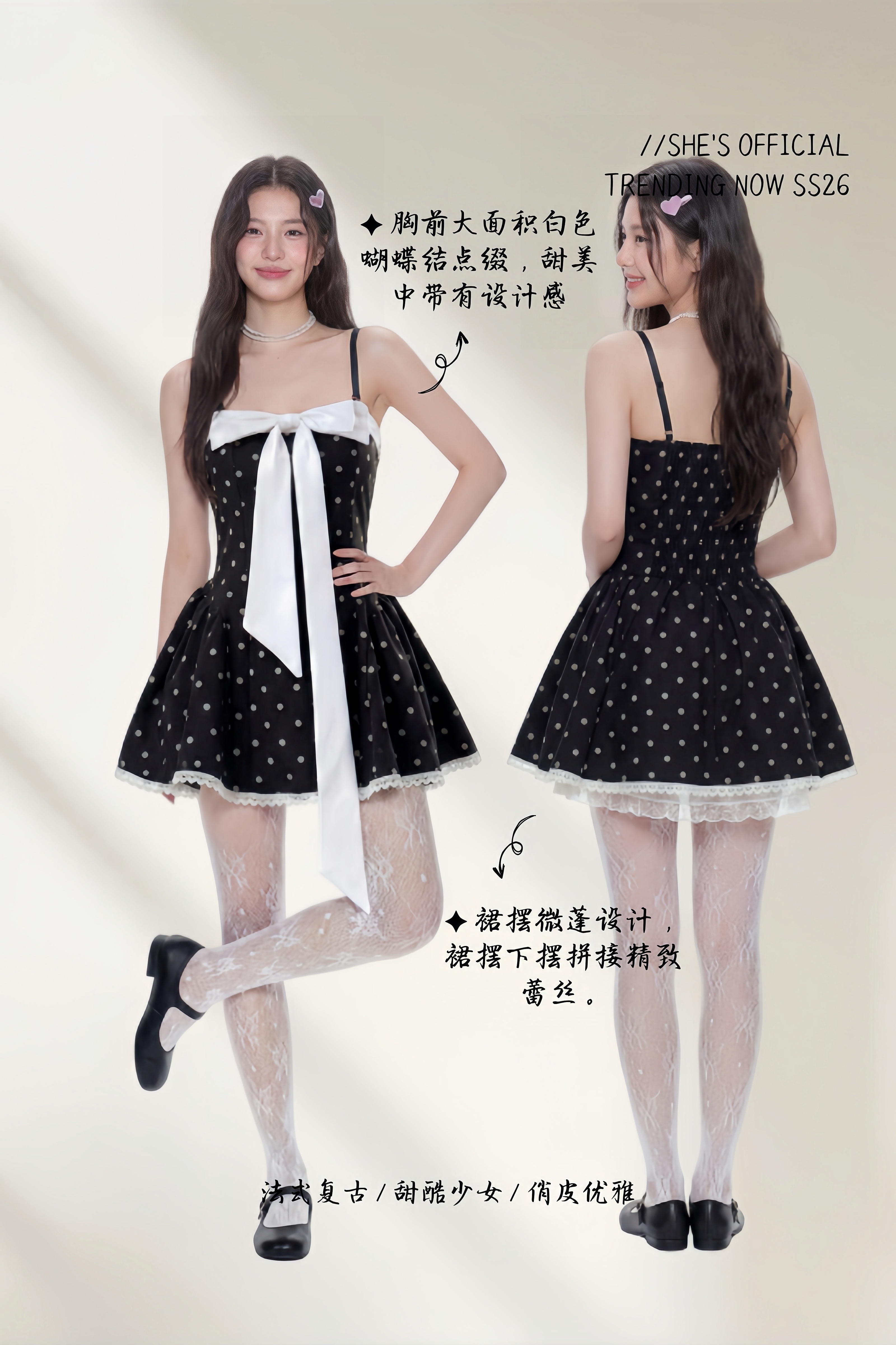 SHE'S甜美系大蝴蝶结吊带波点设计感蕾丝边小短裙