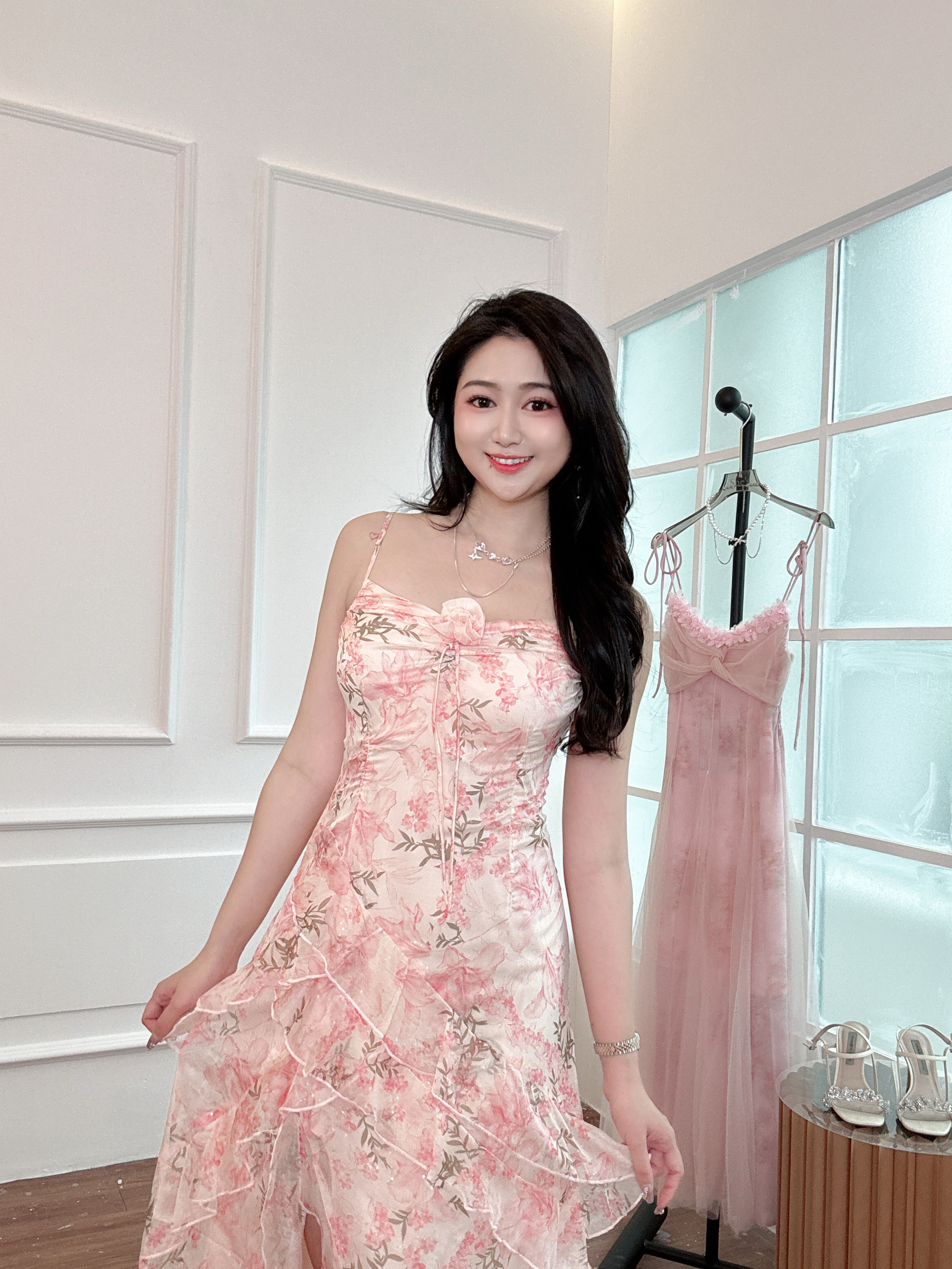 SHE'S仙女系氛围粉花晕染设计感长裙