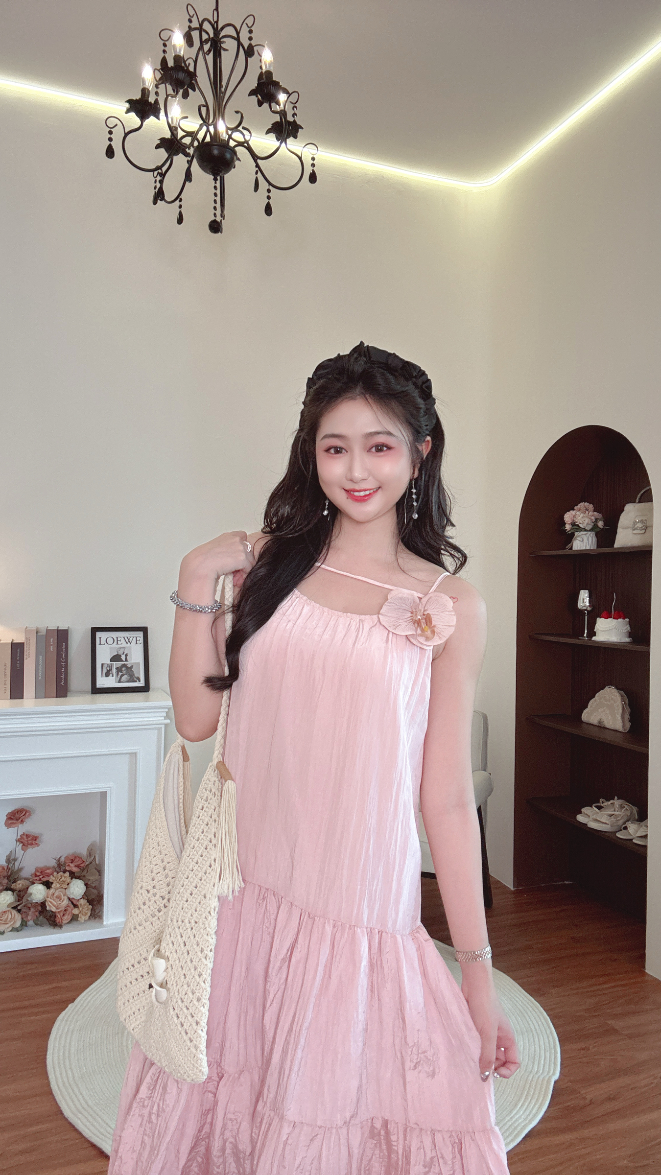 SHE'S法式气质立体花吊带挂肩设计感长礼裙