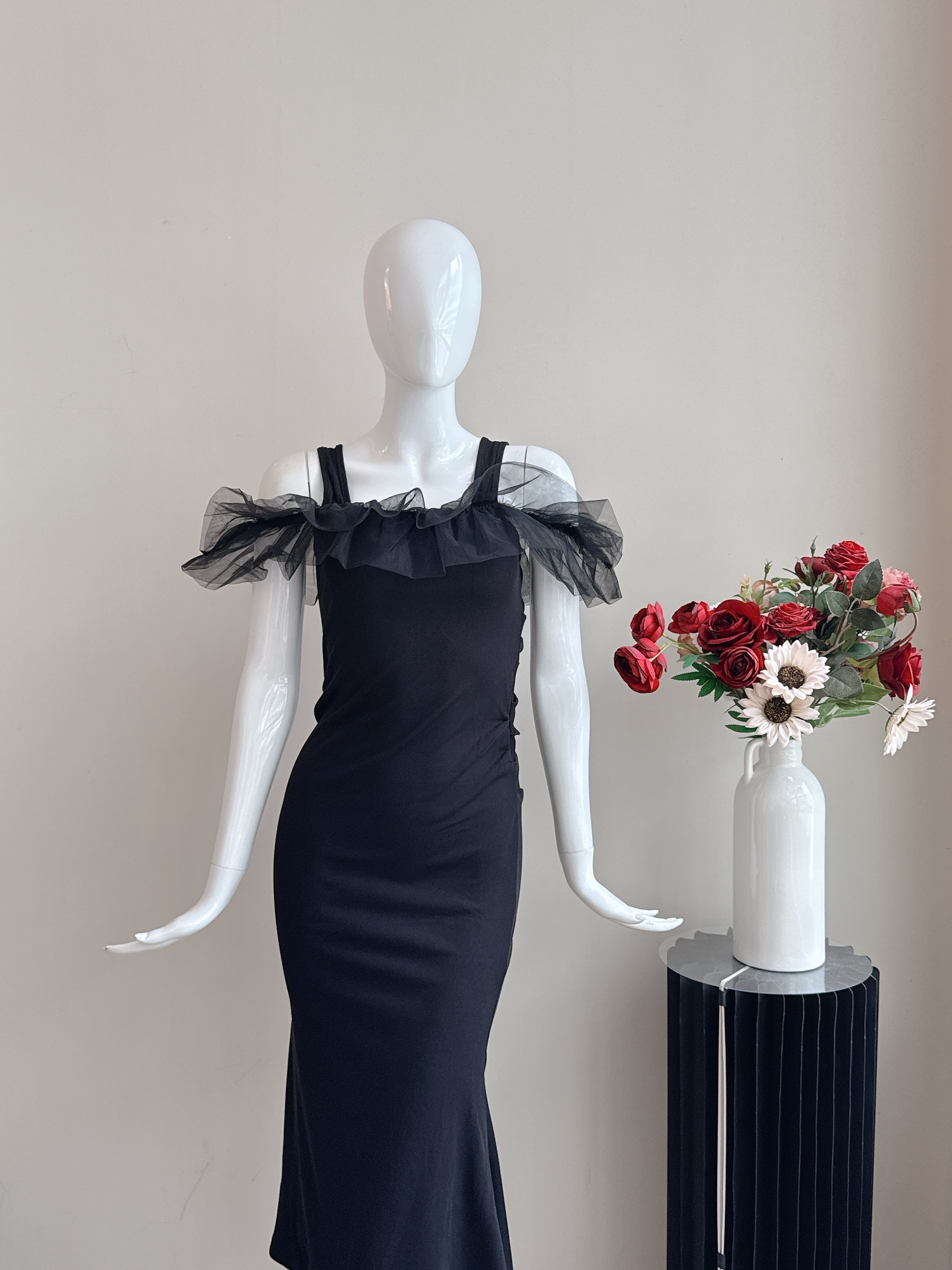 SHE'S高级气质荷叶花边露肩设计感吊带长礼裙
